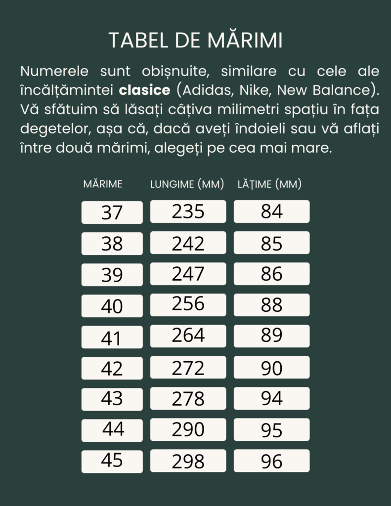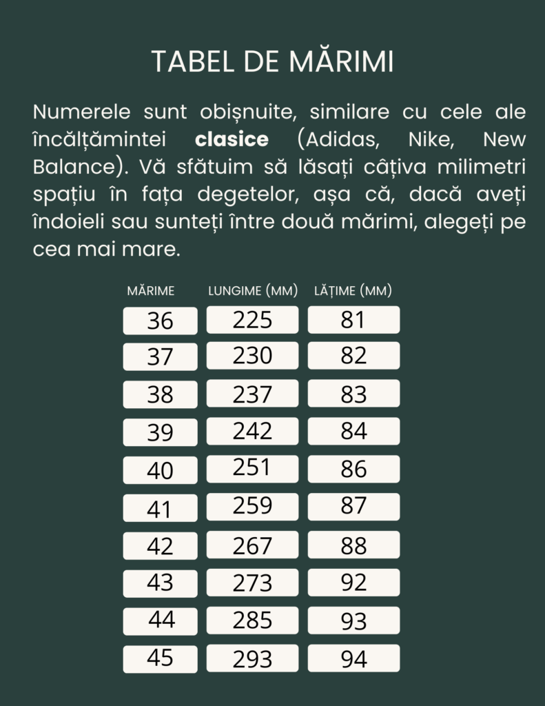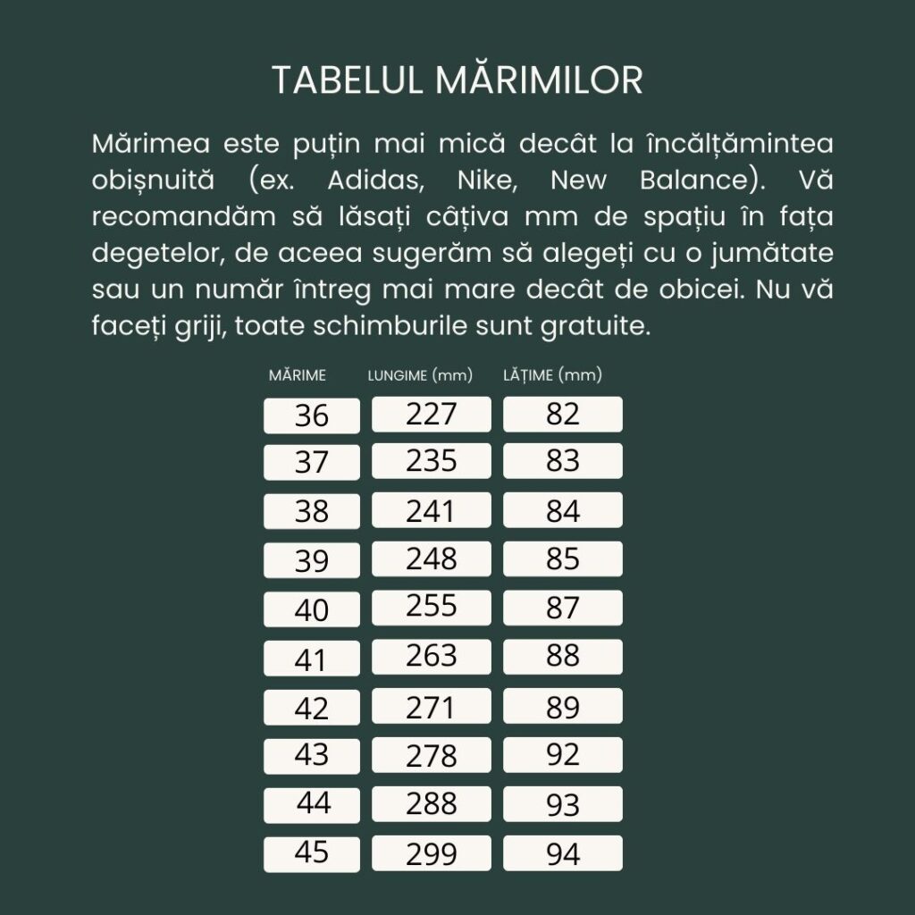 Mai jos puteți vedea tabelul de mărimi și să evaluați care este mărimea potrivită pentru dumneavoastră. Dacă nu sunteți sigur cât de lung și lat este piciorul dumneavoastră, îl puteți măsura. Faceți acest lucru stând pe o foaie de hârtie, cu călcâiul lipit de perete, și trasați o linie la vârful degetelor. La această lungime adăugați aproximativ 5 mm și veți obține mărimea potrivită pentru dumneavoastră. Încălțămintea barefoot trebuie să fie confortabilă, așa că, în caz de îndoială, recomandăm întotdeauna să alegeți o mărime mai mare decât una mai mică.